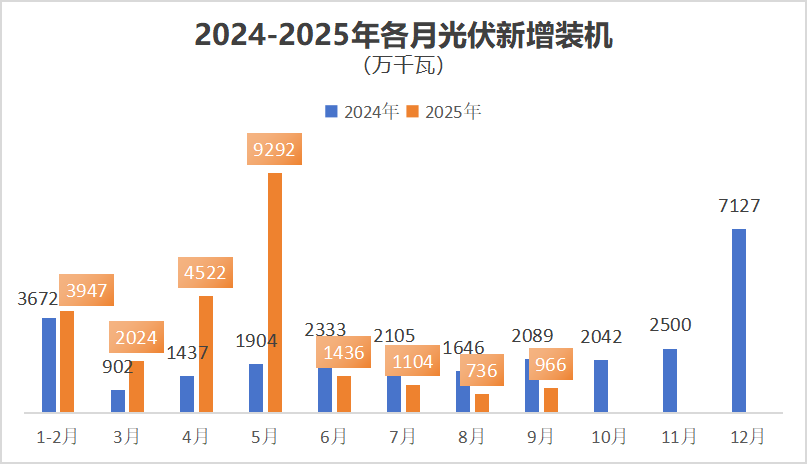 10月26日,国家能源局发布1-9月份全国电力工业统计数据。截至9月底,全国累计发电装机容量37.2亿千瓦,同比增长17.5%。其中,太阳能发电装机容量11.3亿千瓦,同比增长45.7%;风电装机容量5.8亿千瓦,同比增长21.3%。1-9月份,全国发电设备累计平均利用2368小时,比上年同期降低251小时。其中,光伏1-9月新增装机规模240.27GW,9月单月光伏新增规模9.66GW。对比8月数据来看,环比增长31.25%;对比去年同期数据,同比下降53.76%。